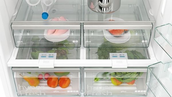 Nem oranı ayarlanabilir hyperFresh plus çekmecesi sayesinde meyve ve sebzeler iki kata kadar daha uzun süre taze kalır.